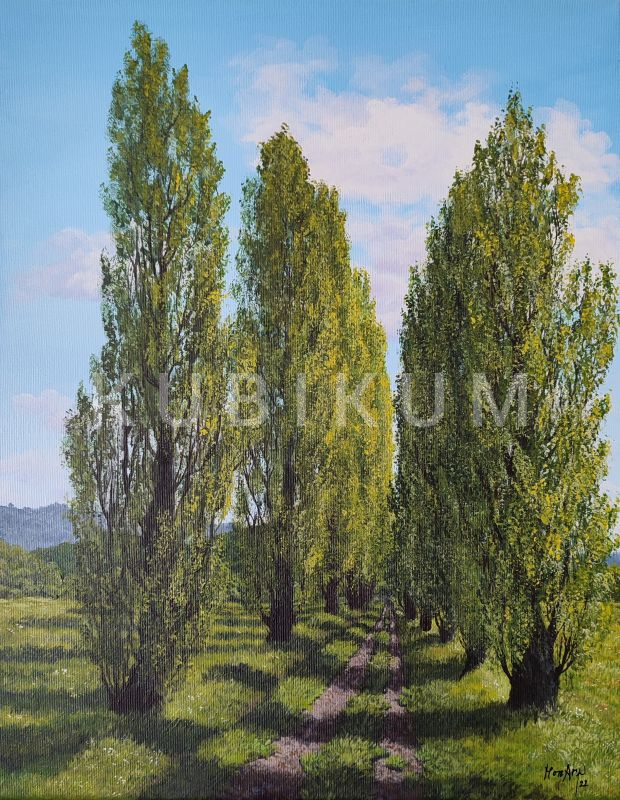 "Obraz zachytáva pokojnú topoľovú alej v letný deň. Inšpiráciou mi bola táto nádherná scenéria blízko môjho rodného mesta. Vysoké štíhle topole sa týčia k oblohe a vytvárajú alej, ktorá pozýva diváka na prechádzku týmto pokojným miestom."