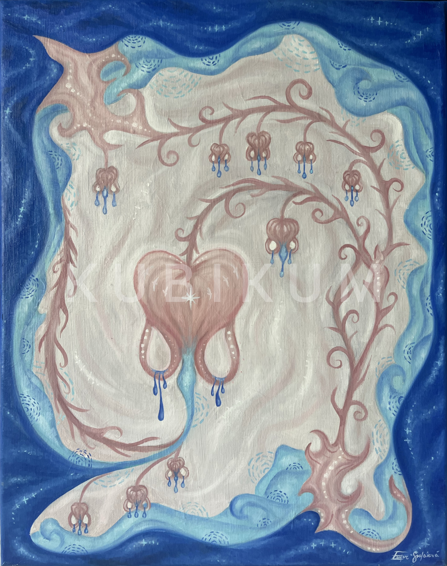 Dielo zobrazuje prepojenie ženskosti a plodnosti s prírodou v ornamentálnej forme, kvetiny srdcovky a vlny dávajú dojem náhľadu do vnútra a zároveň symbolizujú stabilitu a neustálu premenu. Centrálny kvet pripomína maternicu s organickými líniami, ktoré predstavujú korene a žily.
